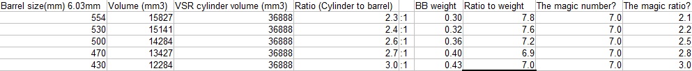 Aha,tak už tomu začínam chápať  okej teda, vieš mi ale povedať ako určuješ dĺžku hlavne ak poznám typ valca, pružinu a používane BBčka? je na to nejaký vzorec alebo tabulka? Ja som sa dočítal niečo ako že pomer objemu valca ku hlavni by malo byť pri bbčkach 0,36g 2,7:1 takže mne vyšiel objem valca 25 482mm3 čo som dal /2,7 a prepočítal zase na dĺžku hlavne čo mi vychádza 333 mm pri hlavni 6,01. Dávalo by to zmysel? a ako by sa mala meniť tá hodnota pomeru 2,7:1 pokiaľ použijem iné BBčka? Tieto info som našiel na airsoftsniperforum http://www.airsoftsniperforum.com/41-vsr-rifles/6075-advanced-vsr-sniper-building-guide-11.html. Na koľko to je presné ale netuším a popravde ak by mi niekto tieto prepočty potvrdil celkom by mi to pomohlo. Druhá vec či pri skrátení hlavne z 455 na prepočítaných 333 nenastane síce navýšenie FPS ale zhoršenie presnosti.