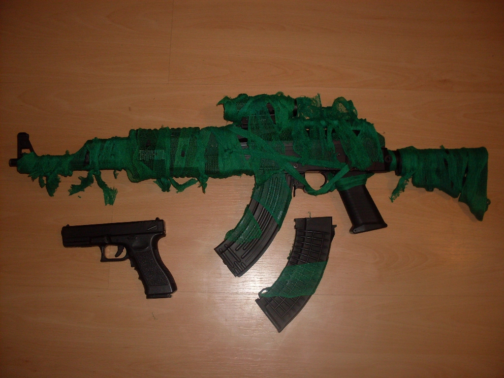 - AK47(cm.O39C) s taktickou pažbou a kolimátorem 1x30, zásobník tlačný 130, točák 550, AEP TM glock18 s plastovým závěrem