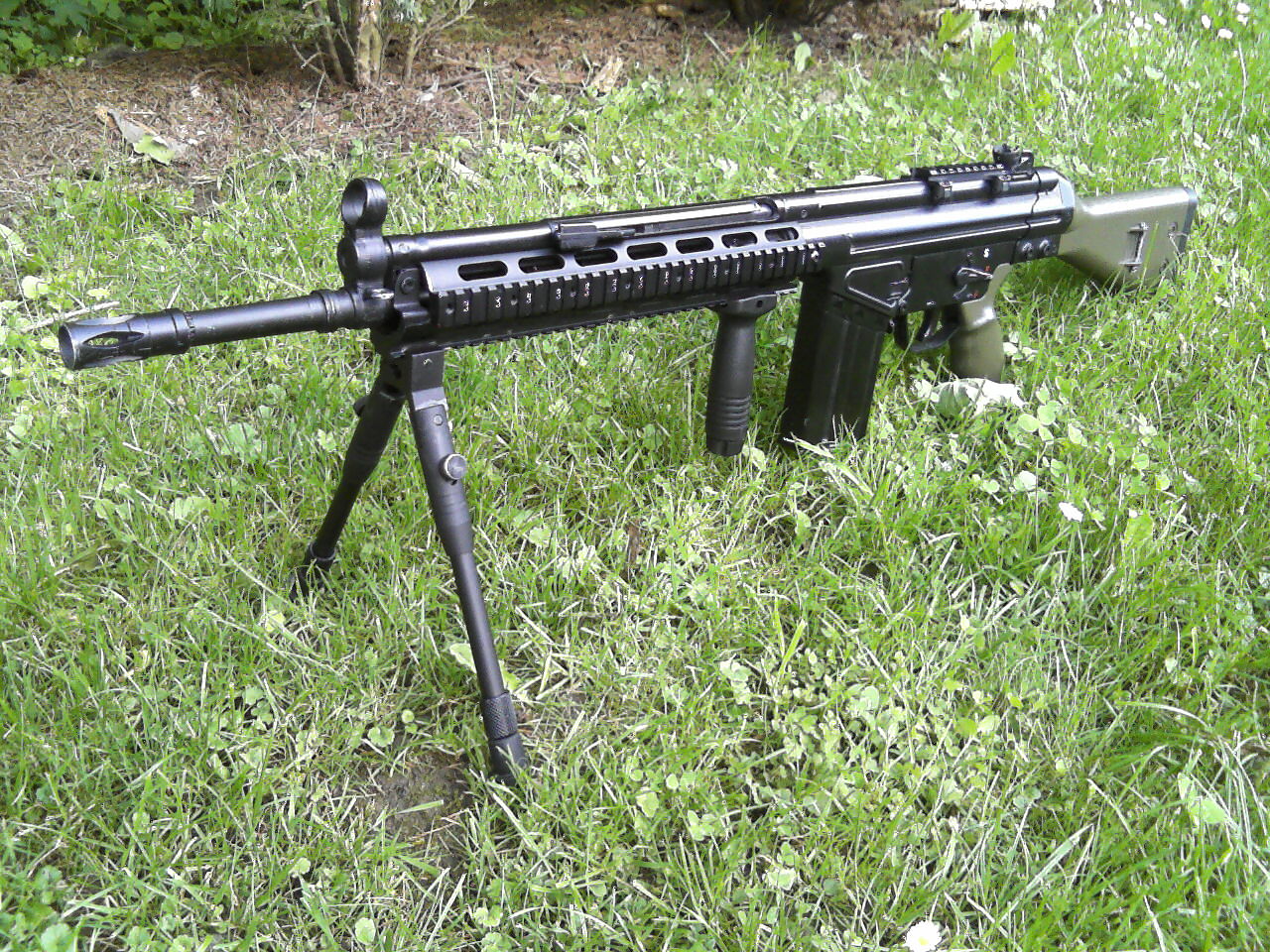 Moje primárka je JG M733 III. generace - po prasknutí mechu téměř vše vyměněno za díly z JG M4A1 II. generace. Hop guma systema. Pružina M110 co jsem našel doma. Vše jsem si dělal sám a poladil pro dobrej výkon. Dal jsem tam motor z MP5SD5 protože původní odešel. Hází to okolo 120-125m/s s 0,25. Foto http://bundeswehr.rajce.idnes.cz/M733_a ... raz100.jpgMoje CQB zbraň je JG MP5SD5. Má pouze motor SRC, přidaný relé a opravenej spoušťák. Ze vnějšku má utrženou natahovací páku, původní patku pažby jsem stratil tak mám měněnou. Foto http://bundeswehr.rajce.idnes.cz/Smes/# ... nikama.jpg ale je to dost stará fotka. Ještě tam chybí patka.