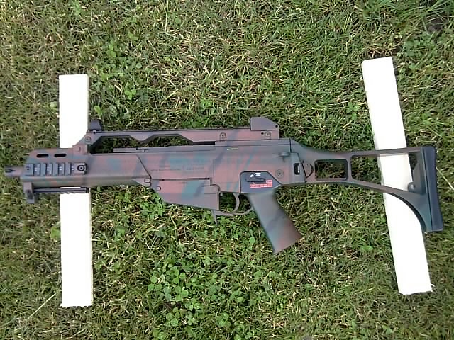 To striekanie bolo jednosuché - má to velké rovné plochy. Ale vyrezávanie tych šablon mi ukradlo asi 50 hodín života. Už by som to tak nikdy nerobil - škoda že ma neskoro napadlo, že by sa to dalo jednoduchšie - Nechať si vyrobiť vo firme čo vyrába a plotruje nálepky šablóny (vyplotrované).Vyšlo by to tak na 10€ a mal by som plné A4 nádherne rovných štvorčekov - bez chýb. S tým by bolo asi digital camo na zbraň náročné asi jak nafarbiť model lietadielka