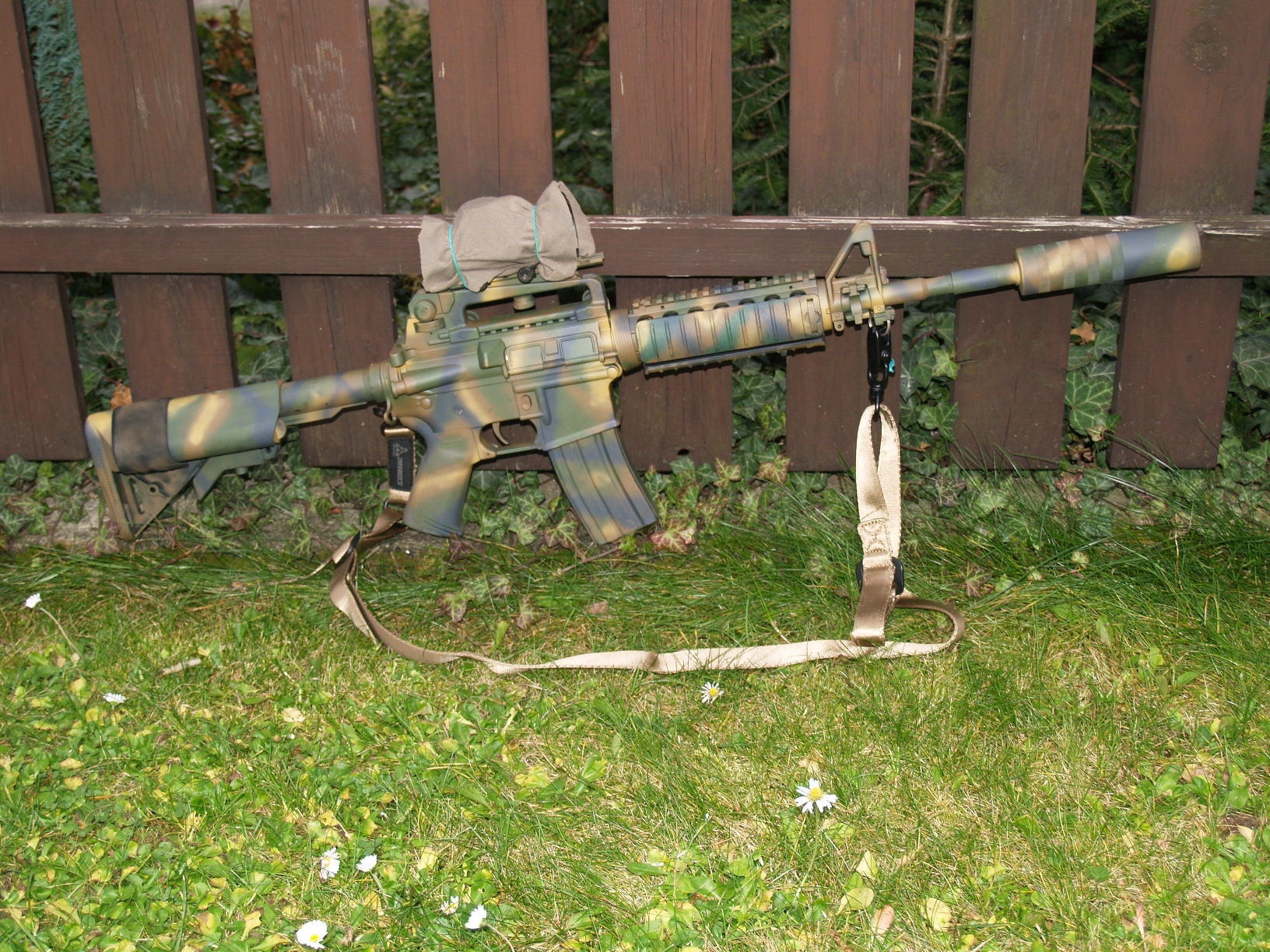 Vypadá to dobře a asi to bude i maskovat  .Ale ta hadra na optice a ten nápis centrákem je hnus když tak už bych tu optiku vzal kobercovkou.