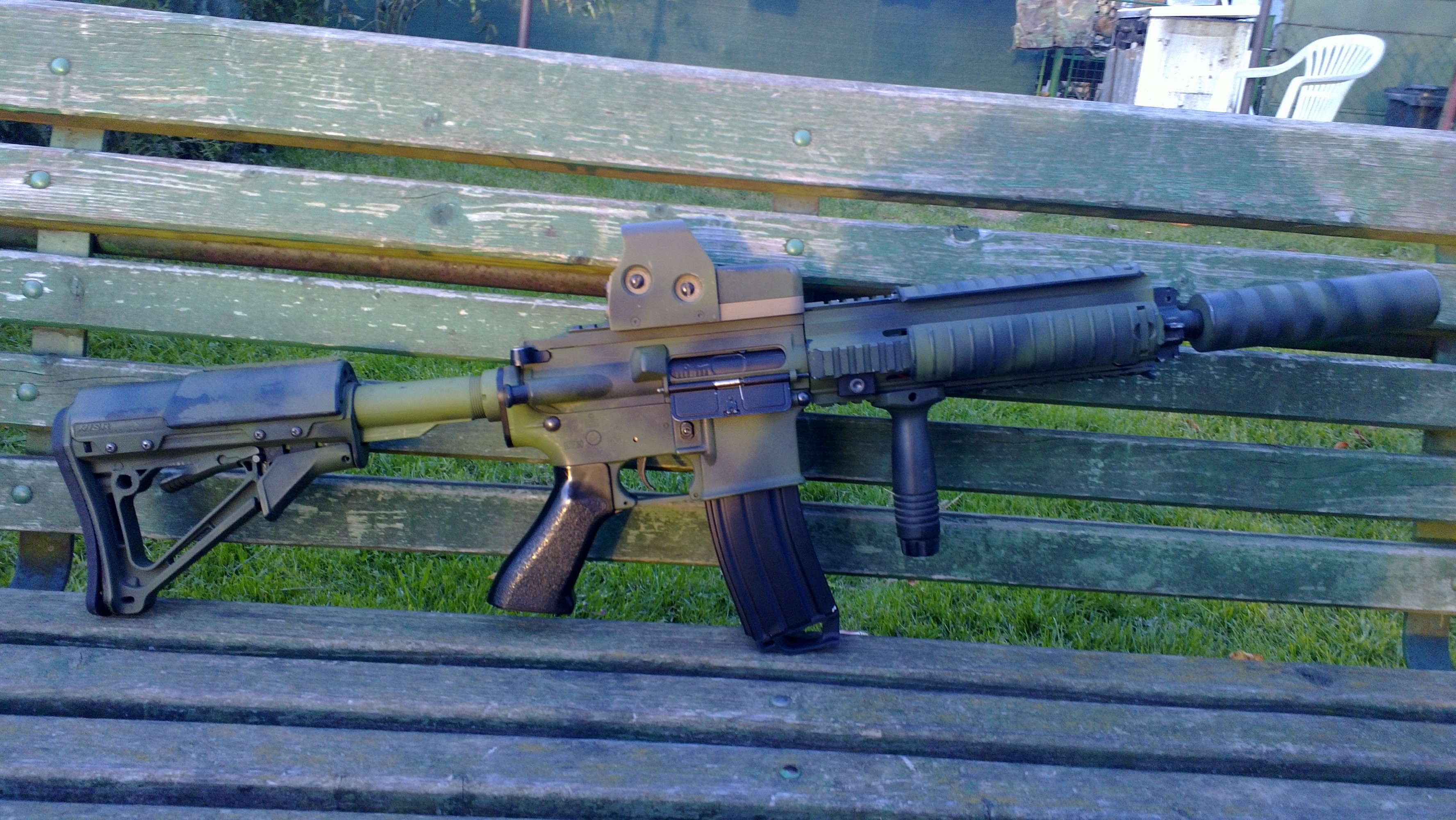 Diky vsem za pozitivni reakce  Dubster píše: Pekne pofotené. Môžm sa opýtať, je to komplet Vltor? alebo len niektoré časti. Odkial si to kupoval  , strašne by som chcel neajkú Vltorku, ale nikde som to zatial nevygooglil . Neni to zadnej Vltor, je to puvodne takova skladacka Aimtop venek a Dboy mechac, ktery sem z nejakejch navic dilu dodelal druhy predpazbi, takze mam dve delky hlavne. Na te kratke je Daniel Defense MK18RIS 7" predpazbi + Vltor sklopna muska a to druhy s 363 mm hlavni je vlastne puvodni AIMTOP RIS predpazbi s nastrikem. Na tele sem vymenil pazbicku a pazbu za MAGPULacky a sehnal baterku 7,4V LiPol 1800mAh, ktera se vejde do trubky. Nemam tam zadnou elektroniku (MOSFET, procerovku) protoze to chci primarne na zimni hrani, je tam totiz 90tka pruzina a MBLOCK. Takze mozna jeste pak upravim nastrik na zimni... reyes102 píše: K čemu je dobrej sucháč na pažbě? Už jsem to viděl víckrát ale furt to nechápu... jestli jen a pouze na morale patch, tak teda potěš  Jinak krása, jak kvér, tak i fotky. Suchac tam mam ted na zkousku, hraju s dratenou maskou a ta casto dre barvu na plastu presne v tech mistech, tak uvidim jestli to k necemu bude...