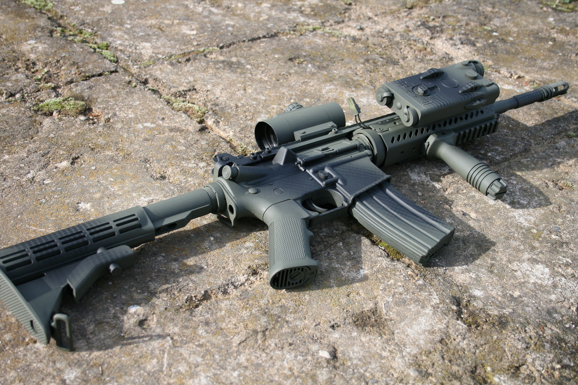 M4 v našem oblíbeným stylu "Dirty", tentokrát v barvách podle A-TACS FG. Chtělo by to ještě trochu vychytat hnědou (opět typickej problém s Krylon, hnědou mají prostě divnou), ale jinak to sedí skoro přesně.  OT: Hadry jsou ACM od Morrise, kdyby někoho zajímaly moje dojmy z tohodle oblečku, tak barevně je to povedený, šití vypadá v pořádku (neodstřižený nitě jsou klasika, ale to se dalo čekat). Látka je typickej papír nylon/cotton jako třeba u ACU, ale tohle je na omak tenčí, tvrdší, hladší a asi v tom je míň bavlny než 50%... na doma a na práci na zahradě to bude fajn.