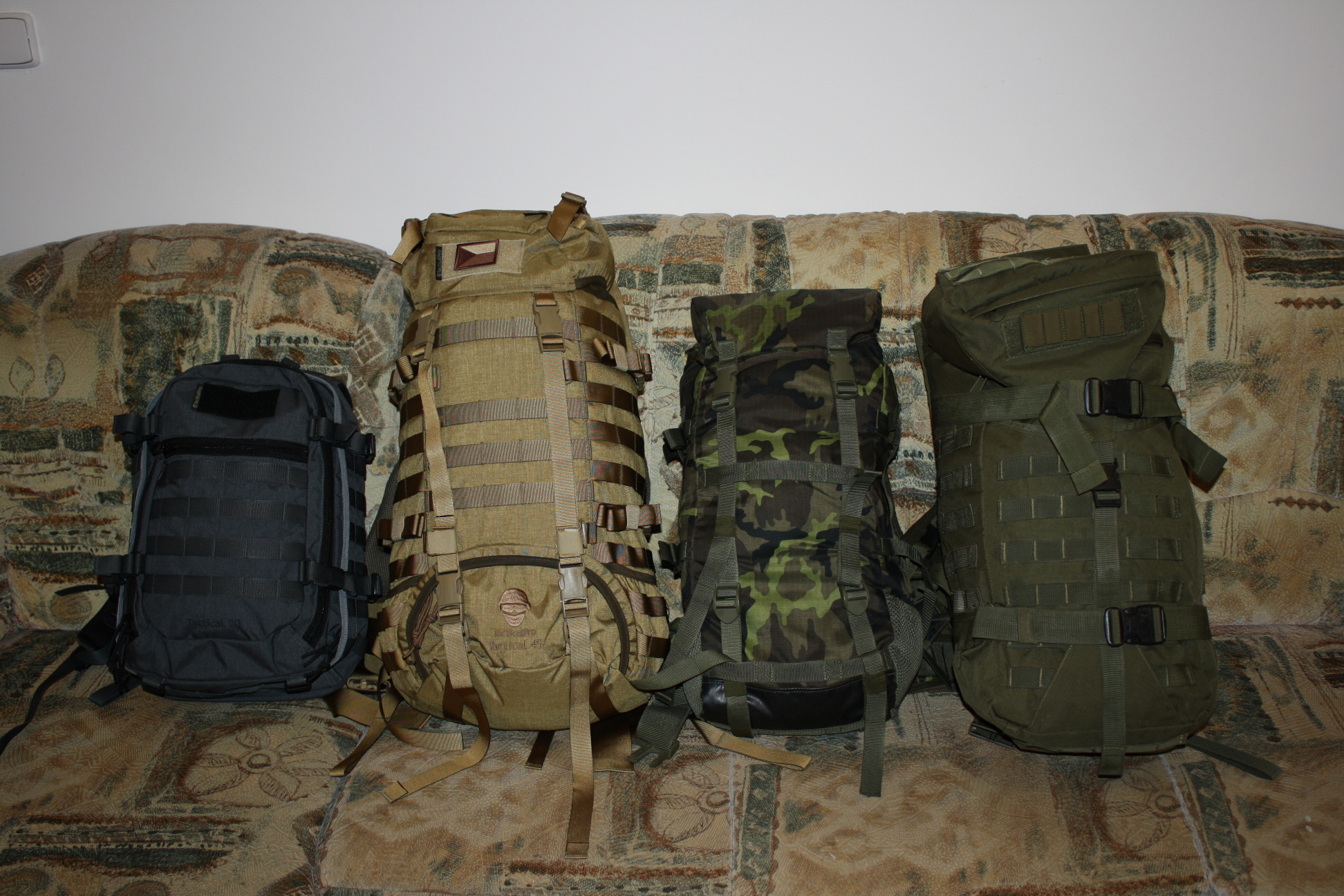 no takze Tactical Pro batohy jsou doma. Kupoval jsem teda Tactical 20 II v šedé barvě a Tactical 45 II v Coyotu. Ta 20ka mě mile překvapila. prostorný dobře řešený batoh. Nošení na zádech zatím pohodlné. 45ka od pohledu taky super. Trochu se bojím těch "posuvných" zad a trochu mě štve obrovské množství popruhů které přečnívají (i s těma killerama popruhů je jich pořád dost). Nicméně jsou dobře umístěné, takže nabalit okolo batohu hromady dalších věcí nebude problém. Z fotek na tacticalpro.cz mi ta 45ka přišla "stejná" jako asi nejrozšířejnější bágl a to SPM20ka. ovšem na živo vedle sebe je opravdu ta 45ka 2x větší. Matroš je na obou batozích festovní, pohodlné jsou záda, popruhy i bederák. Oba batohy mají kapsy a vývody na camelbag. Na nějaké obecné objektivní hodnocení je brzo, ale co se týče materiálu a zpracování tak tacticalpro mi připadne mnohem dál než SPM. V příloze dávám dvě fotky - srovnání 4 batohů. Zleva 1) Tactical Pro 20 II 2) Tactical Pro 45 II 3) SPM 20 4) Kopie Eberle Gunslingerpack ps: zajímavé je, že SPM udává u svého batohu objem 20 litrů, stejně tak jako Tactical Pro u Tactical 20ky