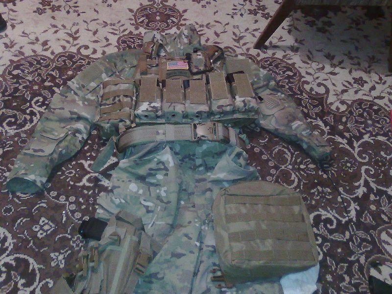 Multicam(camogrom) od Helikonu nohavice a takticka bluza, vesta plate carrier, opasok Warrior, stenna kapsa na zasobniky, stehene puzdro a kanady vz 2007.