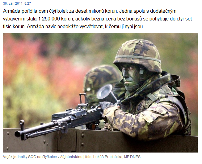 reyes102 píše: Pojďme se smát http://zpravy.idnes.cz/dalsi-predrazeny ... _domaci_hvCenu čtyřkolek bych neřešil, nepřijde mi to až tak strašný a navíc tomu nerozumím (narozdíl od novinářů)... a zmínka o tom že ty čtyřkolky nejsou potřeba? když nějakej šmoula zruší SOG, tak je jasný že už je SOG nepotřebuje. Ale ilustrační fotka sogu na čtyřkolce je fakt exkluzivní. Přitom by stačilo kdyby napsali do googlu "sog na čtyřkolce" a vypadne jim krásná fotka z jejich vlastního serveru  Nicméně to nemění nic na tom že je venku další kauza o skvělých nákupech v AČR jsem zvědav co se zase ukáže za měsíc...