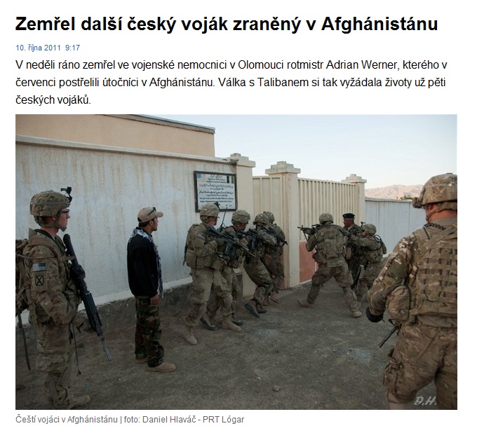 http://zpravy.idnes.cz/zemrel-dalsi-ces ... _domaci_jsV misi OMLT zemřel český voják Adrian Werner. (ilustrační fotka kterou ti idioti z idnesu použily je skutečně na ranu, nechápu kterej idiot nemůže rozpoznat českou a americkou vlajku) To je asi jako kdyby u mrtvýho Jobse použili ilustrační fotku s logem microsoftu