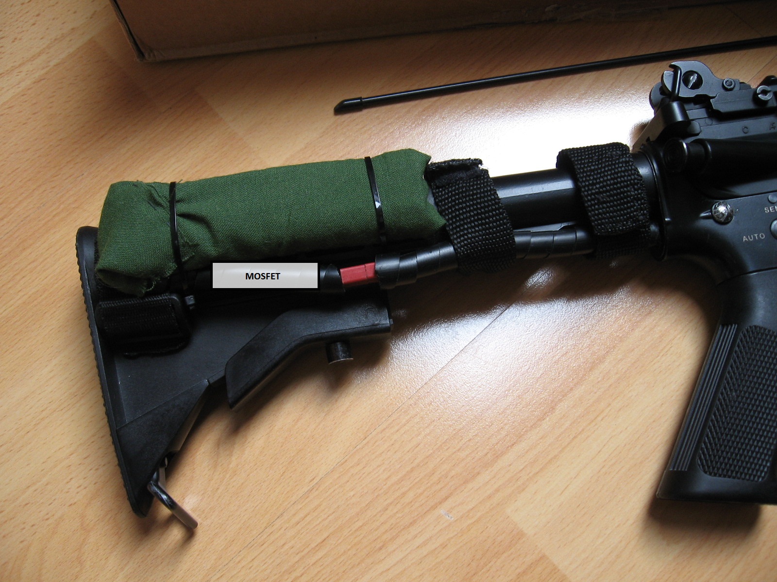 Ja byť tebou dám to takto nejako. Zohnat si to oko s dierou co sa dava medzi pažbu a telo M4, previesť tadial káble, dať ich do chráničky a mosfet bud dať do kapsicky alebo nejako inak vymysliet uchytenie a zakrytie.