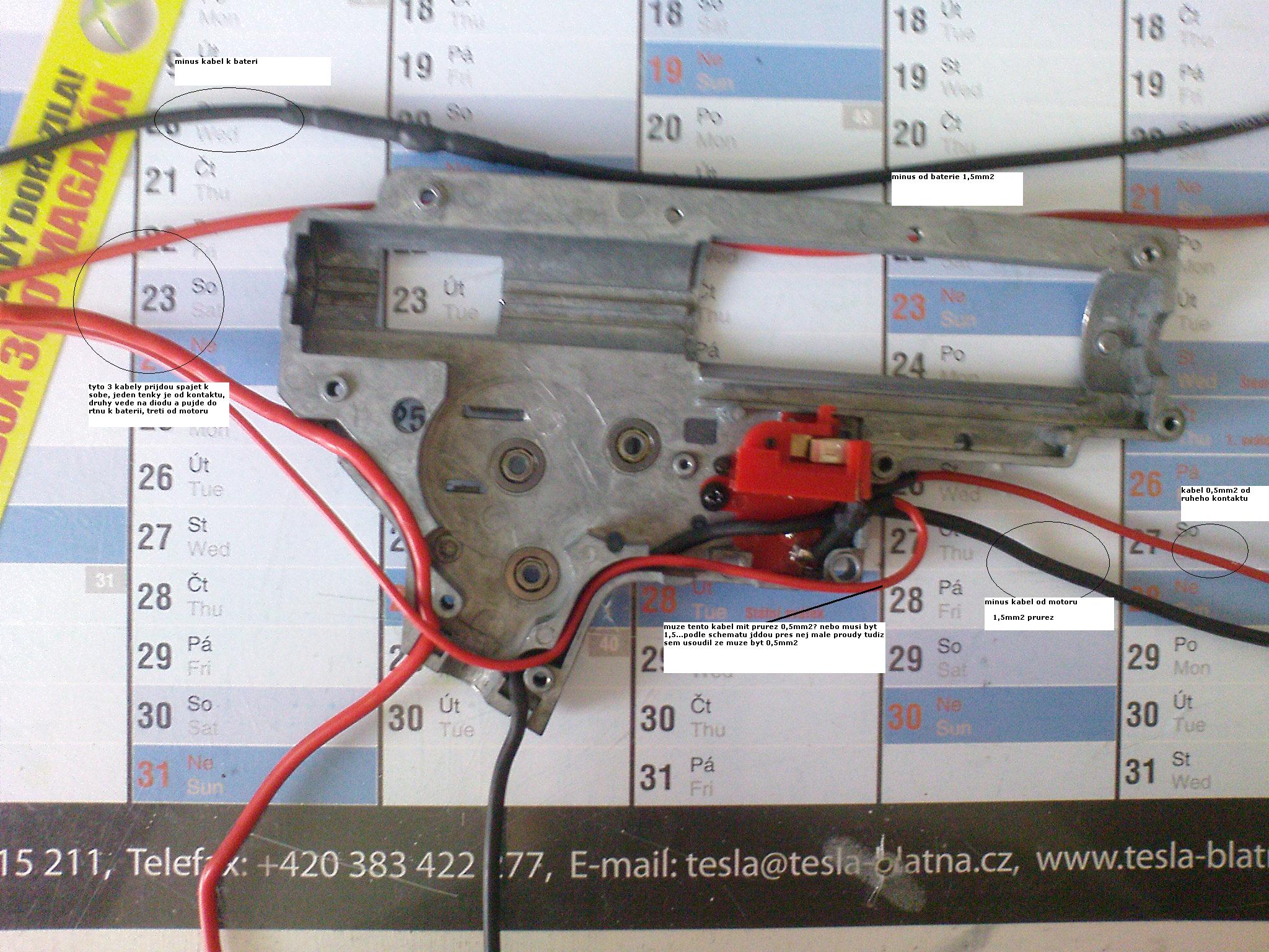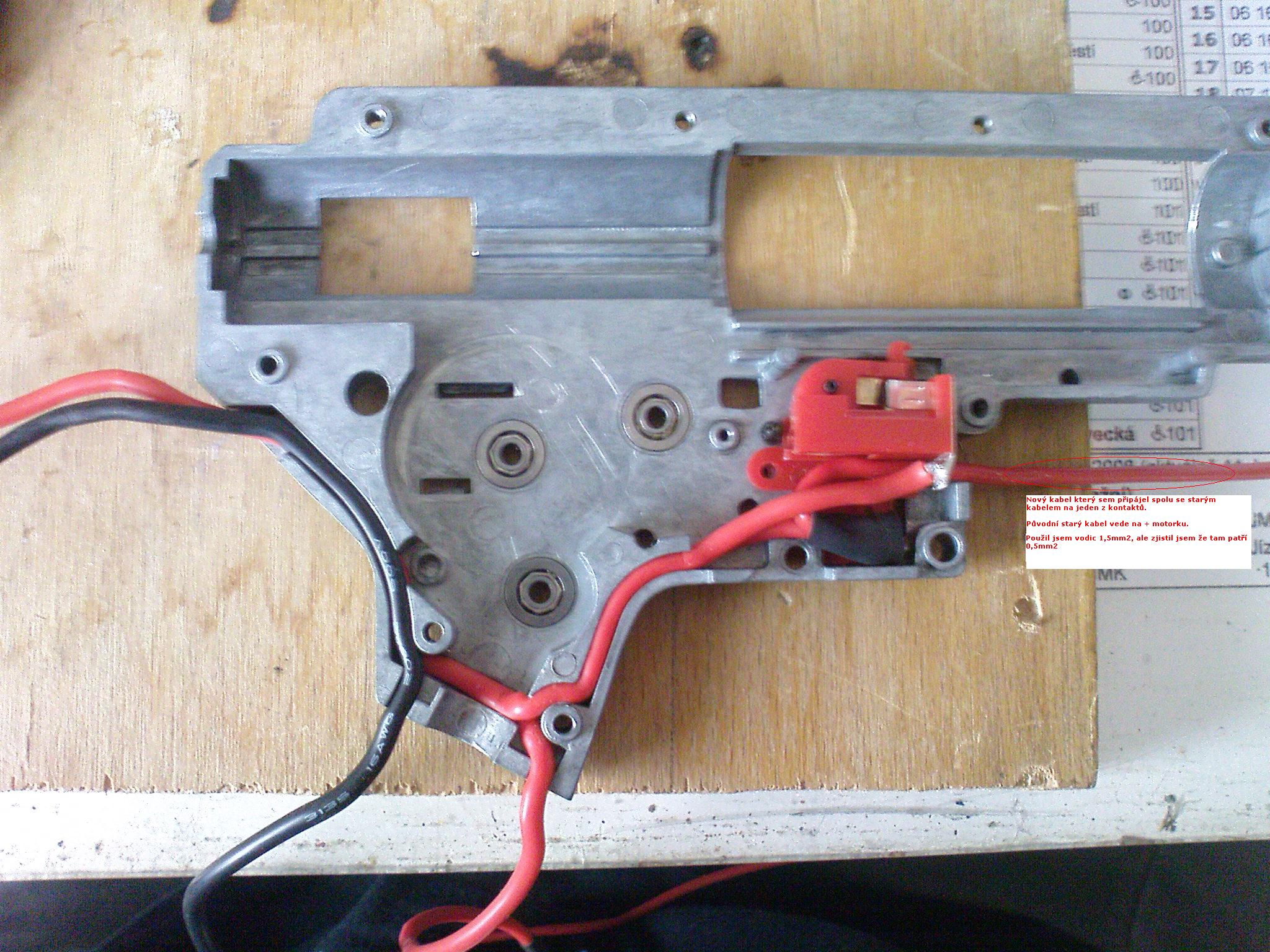 EDIT/ aha už se v tom orientuju...z předpažbí do těla pudou celkem 4 dráty Kde budou 2 s tlouškou 1,5mm2 (s barvou červená), 1 bude s tlouštkou 0,5mm2 (barva červená, ten příjde napajet na jeden kontakt) a poslední bude černá 1,5mm2 ten pude k motoru a na baterku.