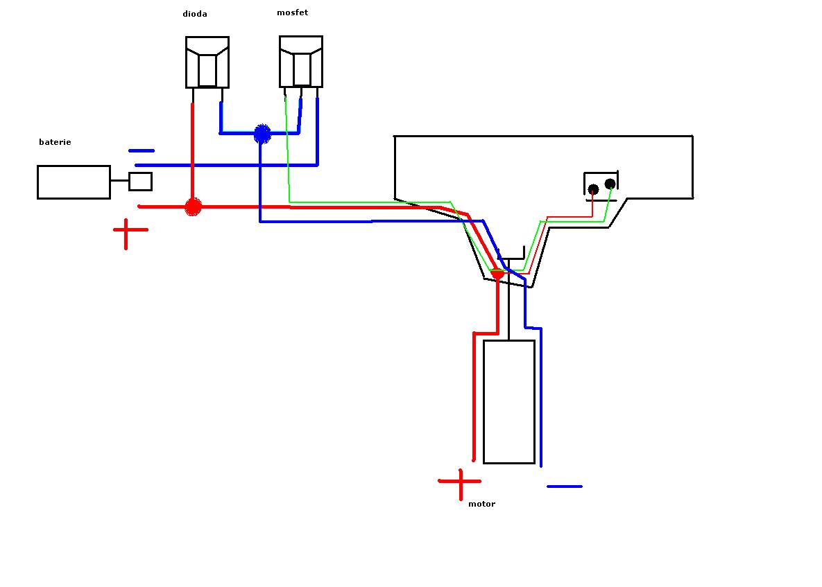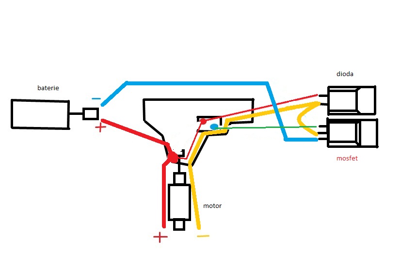 Mechem veď jen kabel [motor (+) ; dioda ; spínač] a [mosfet ; spínač] a [motor (-); dioda ; mos-fet].