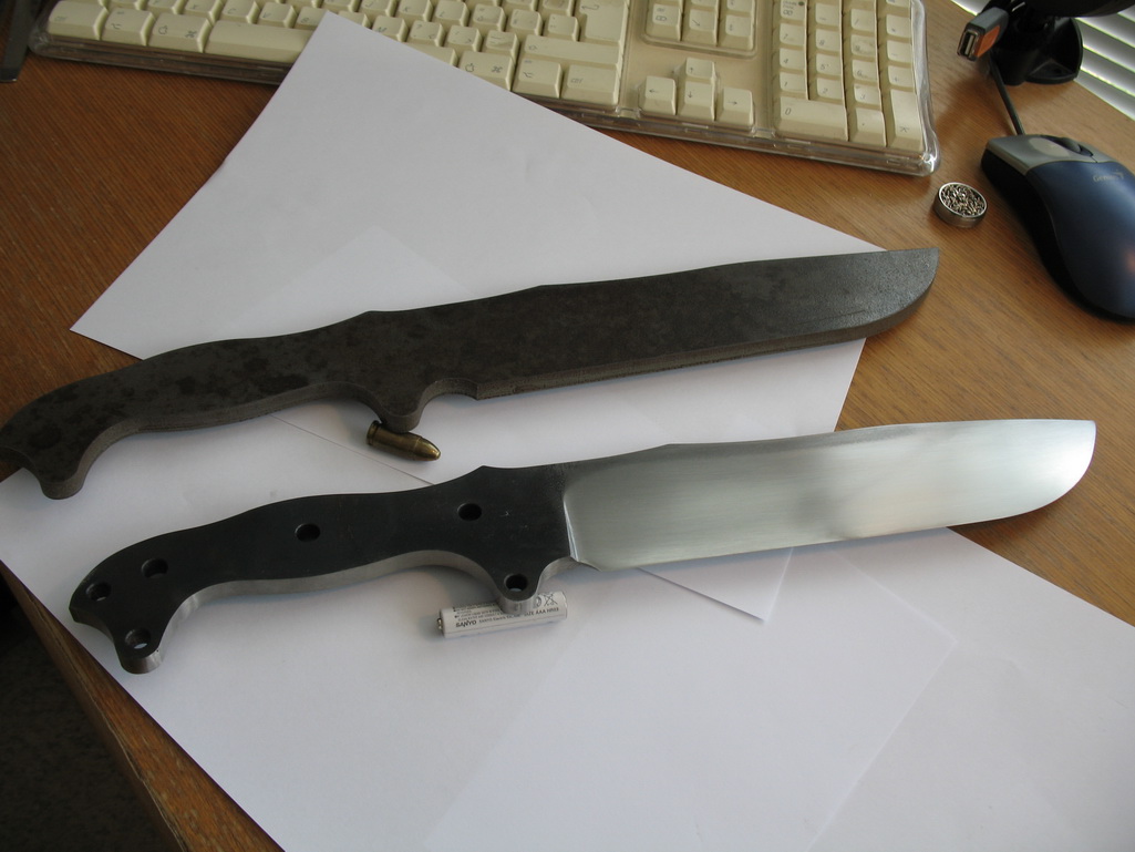 Tak je tady ten památnej den, dorazila mi vybroušená a zakalená čepel od nožíře  Je to full konvex(tzv čočka) nabroušená tak, že jednim lehkym tahem rozíznete A4 na výšku a kalená není jeko celek, ale ostří je o moc tvrdší než hřbet....což znamená, že je nůž parciálně popouštěnej a ve hřbetu má navíc 8mm  .....nožíř prohlásil, že lidskou silou nůž v podstatě nejde zničit a potom, co jsem viděl jeho práce na knife.cz tomu skutečně věřím Tímto děkuji nožíři s nickem Želva, za úžasnou práciNůž při nejbližší příležitosti dobrousím, ostřenkuju a navrhnu a nechám vyrobit koženej kabátek, aby mu nebyla zima Přikládám fotky - porovnání velikosti s ESEE4 a CZ75D od ASG, porovnání síly hřbetu - ESEE má cca 4,8mm, porovnání velikosti s Acronem, kterýho asi dost z Vás bude znát, hmotnost, porovnání s původním polotovarem a nakonec přikládám fotky přibližný podoby pouzdra z netu. Mám takovou radost, že se asi popupínkuju....už jsem se stihnul i říznout