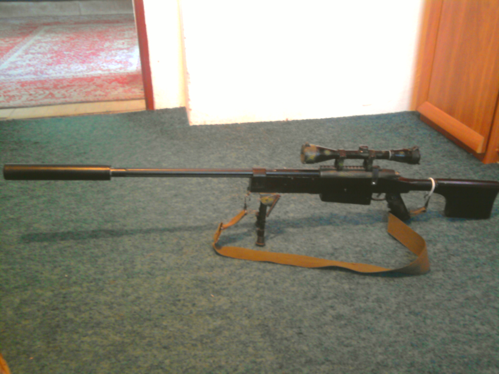 Bráchova puška. Je blázen do velkorážnejch pušek. Sniper rifle MK 15 mod 0. (McMillan TAC-50) Vnitřnosti z APS-2, vevnitř 380% set. Pažbení plech 2 mm. Váha cca 6 kg.