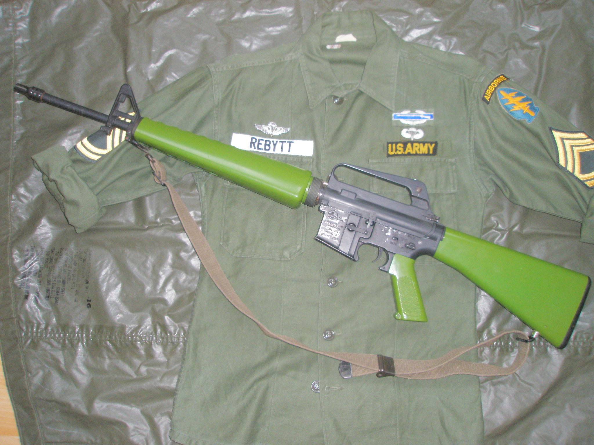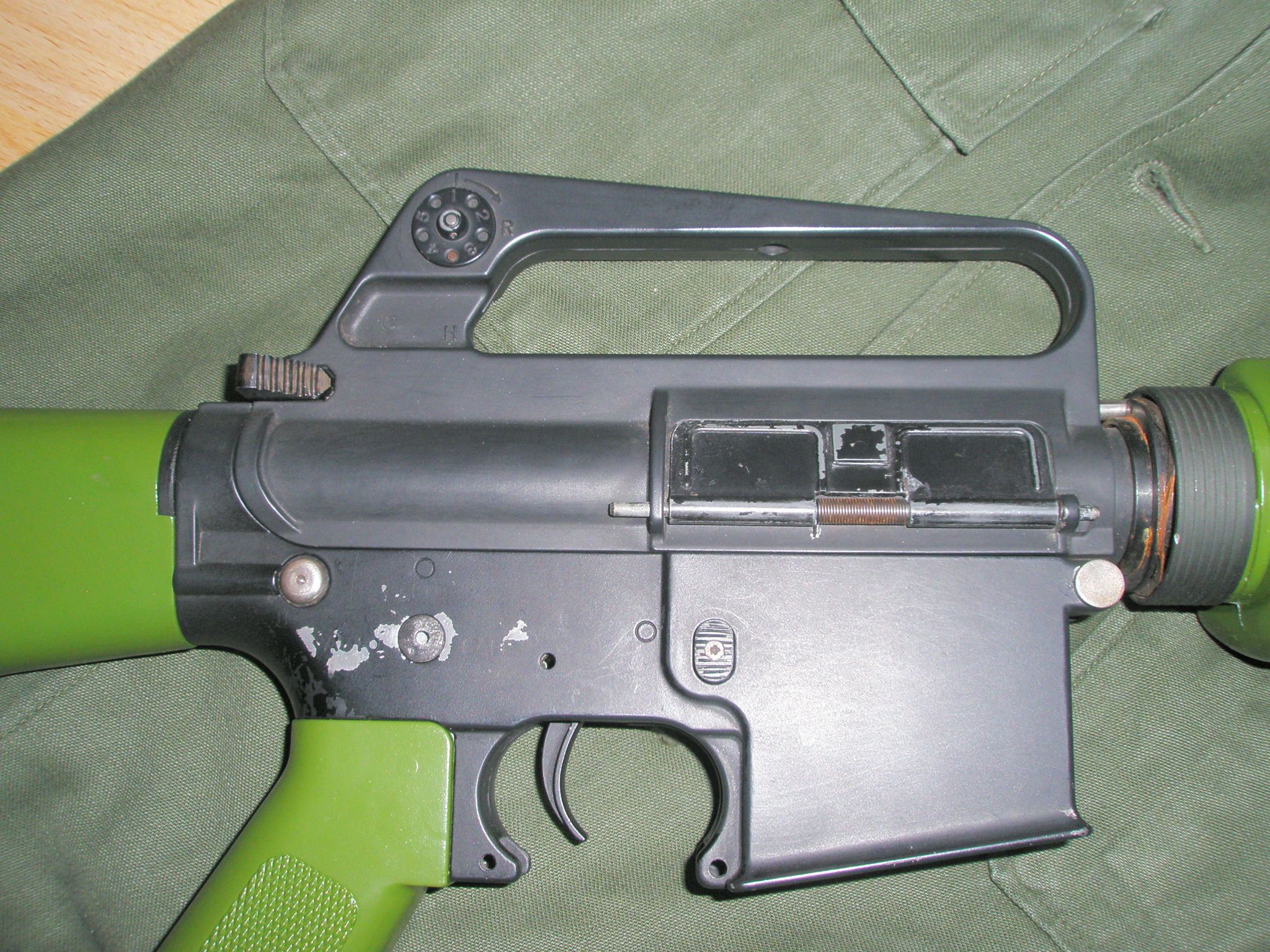 M16 M601 původně to byla M16 M602 od G&P má všechno co má M601 mít - zelený pažbení, flashider "duckbill", specifickou ražbu na těle, čepy, upravenej bolt catch, přepínač střelby, vyhazovací okýnko, páku, uvolňovač zásobáků... seriový číslo odpovídající realitě, avšak 1313 Příloha: