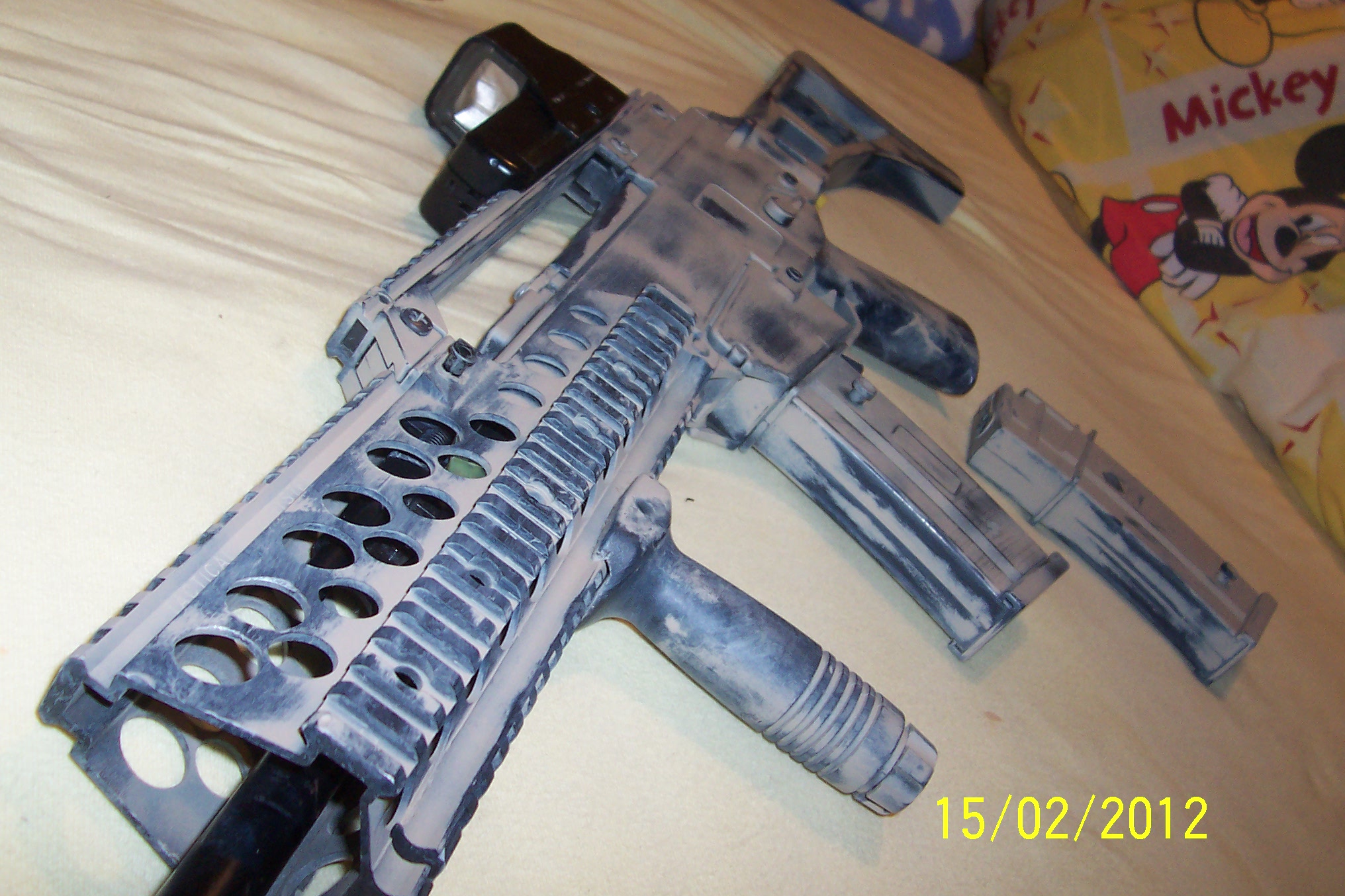 Jo, máš pravdu:-) Sem hňup  a plácám chujoviny http://en.wikipedia.org/wiki/Heckler_%26_Koch_G3Není to juta, je to pro mně mnohem dostupnější- levnější materiál: obvazy  část je bíla-barvená na zeleno / béžovo, část už byla zelená (tuším že ty jsou v obvazech vz.80) Jutu sem kdysi na tohle používal, ale v terénu se to až moc páralo, třepilo a lezlo to ze zbraně dolů, nebo sem měl každou chvíli čočku na optice plnou vláken  s obvazem tohle neřeším ony se rozpářou, zmoknou ale pořád drží, v podstatě tak, že to nemusím sundávat ani při rozborce (jen část která je mezi tlumičem a hlavní, protože pro rozborku musím odšroubovat tlumič) pod tím je ještě barevný nástřik ale vypadalo to divně, takhle se mi líbí víc:-) (podstatný faktor)