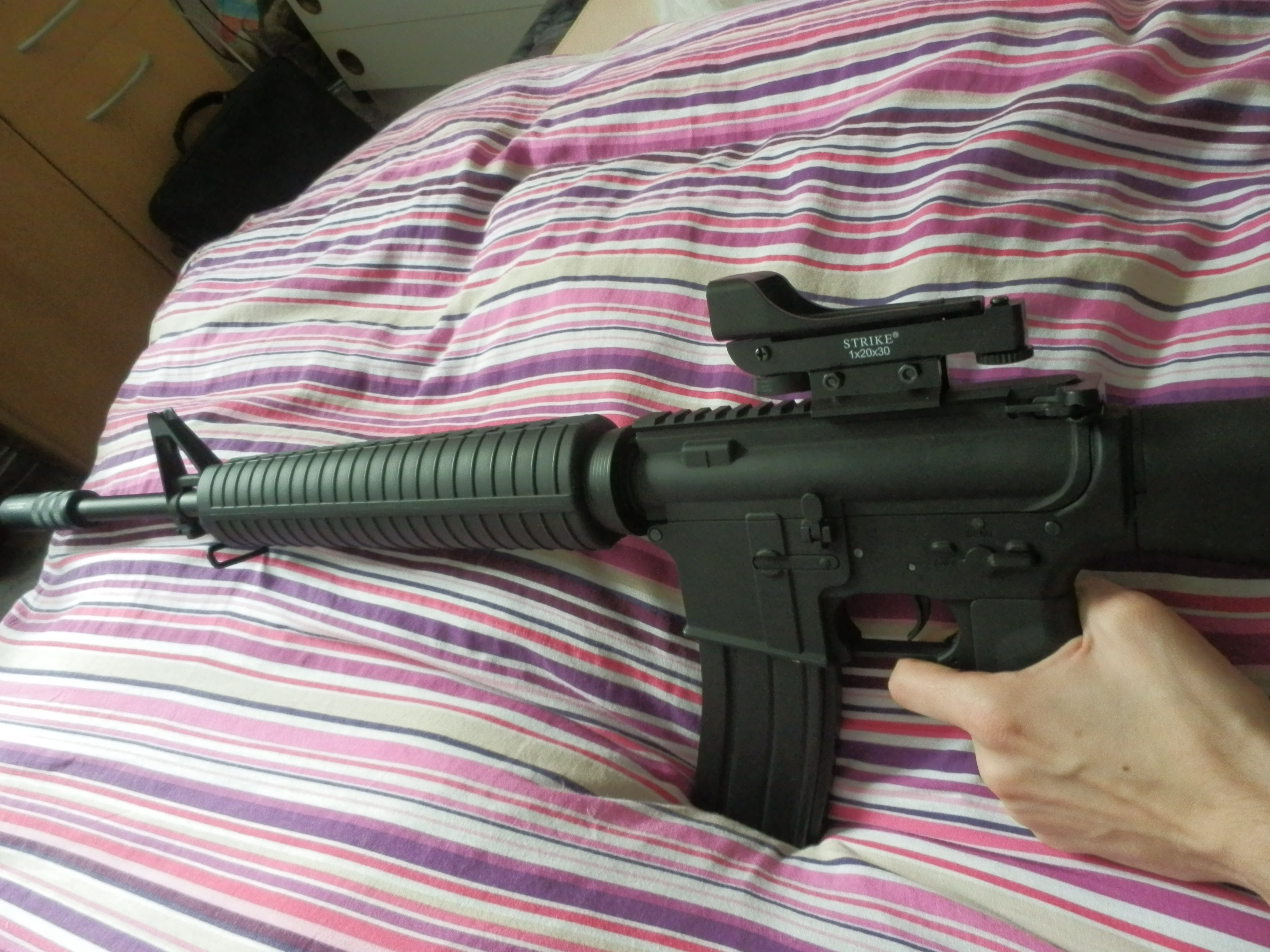 Tohle je moje zbraň, airsoft už moc nehraju, takže to mám jen tak na okuk. Uvnitř jsou různé kolečka, co se točí. Fotka by Reyes. https://scontent-b-sjc.xx.fbcdn.net/hph ... e=546F908F