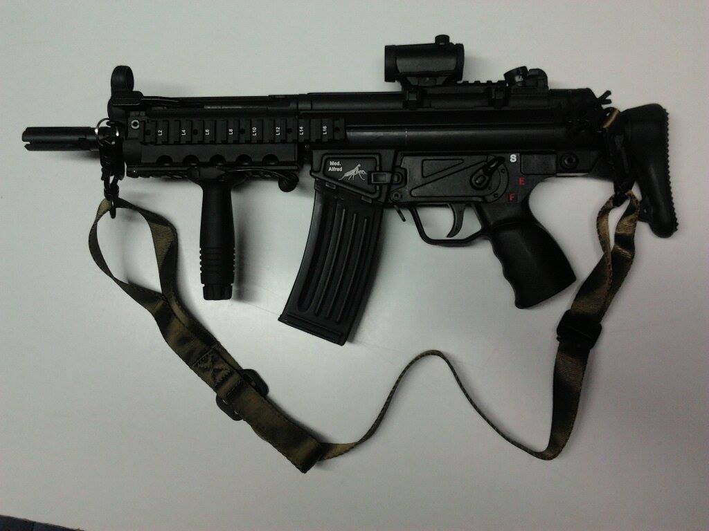 Konečně jsem si postavil vlastní HK53. Určená spíše na střední a kratší vzdálenosti, CQB a noční boj. Základ je CA53 s výsuvnou pažbou (nejblíže ji už měli už jen na Slovensku, jinak vzácné zboží), G&G RIS předpažbí pro G53, lehký upgrade - výkon 115-120 m/s s 0,20g (fak mi to bohatě stačí i do lesa), integrované nasvětlování kuliček, vlastní laserové značení (miluju kudlanky, doma jednu mám). Toužím dát místo ručky granátomet, ale ta hlaveň by to už asi nedala. Je to můj jediný trochu moderní kvér  Příloha: