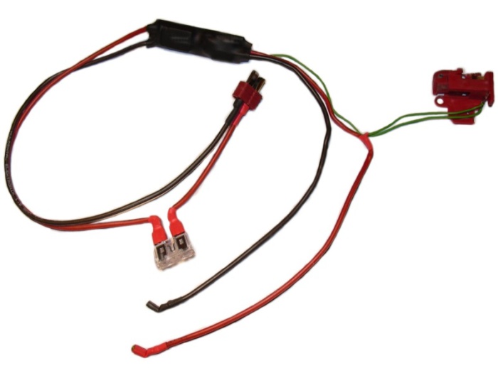 Na fotce je na zakázku vyrobená kabeláž pro zbraň M4a1 s baterií uvnitř předpažbí. Spoušťové kontakty byly použity původní ze zbraně.
