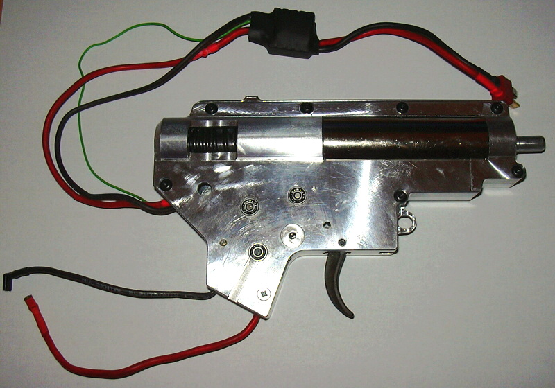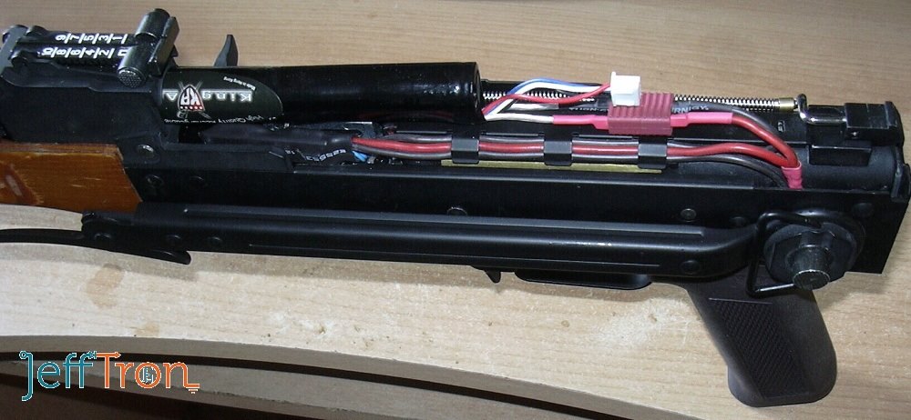 Na fotce je na zakázku vyrobená kabeláž s mosfetem (umístění vedle hop-up komory) pro zbraň AKS74 s baterií nad mechabox nebo na kovovou sklopnou pažbu, kabeláž byla montována přímo na mechabox, který zázazník poslal.