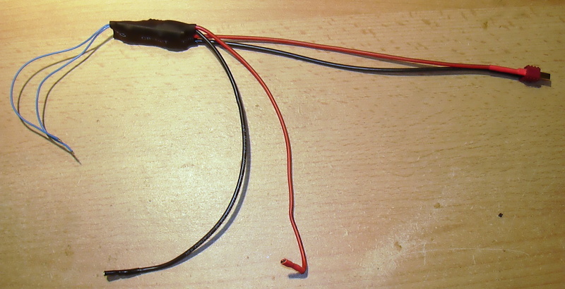 Použitý materiál: 1 * Černý kabel 1,5 mm2 se silikonovou izolací = 28 Kč 1 * Červený kabel 1,5 mm2 se silikonovou izolací = 28 Kč 1 * Tamiya konektor malý - samec = 19 Kč 3 * Bužírka 3mm mix - 2 ks = 12 Kč 1 * Bužírka 3mm červená - 2 ks = 4 Kč 2 * Faston dutinka 2,8mm - 2 ks = 16 Kč 2 * Dutinkový konektor 2mm - 1 pár = 34 Kč 1 * Plochá pojistka mini - 20A = 8 Kč 1 * Kompletace kabeláže = 150 Kč ----------------- celkem = 299 Kč