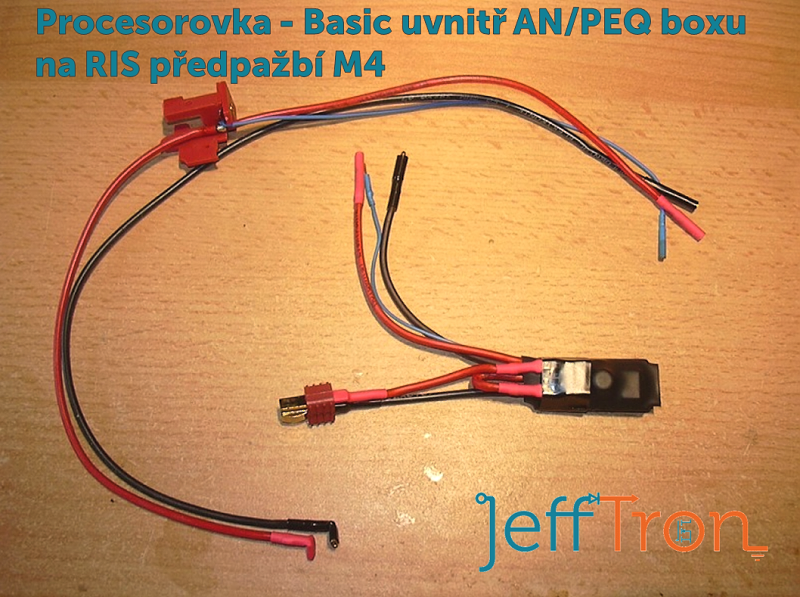 Na fotce je na zakázku vyrobená kabeláž s Procesorovkou - Basic u zbraně M4A1 s baterií v AN/PEQ boxu na RIS předpažbí. Procesorovka je umístěná uvnitř boxu spolu s baterií. Sestavení kabeláže s procesorovkou je zdarma.