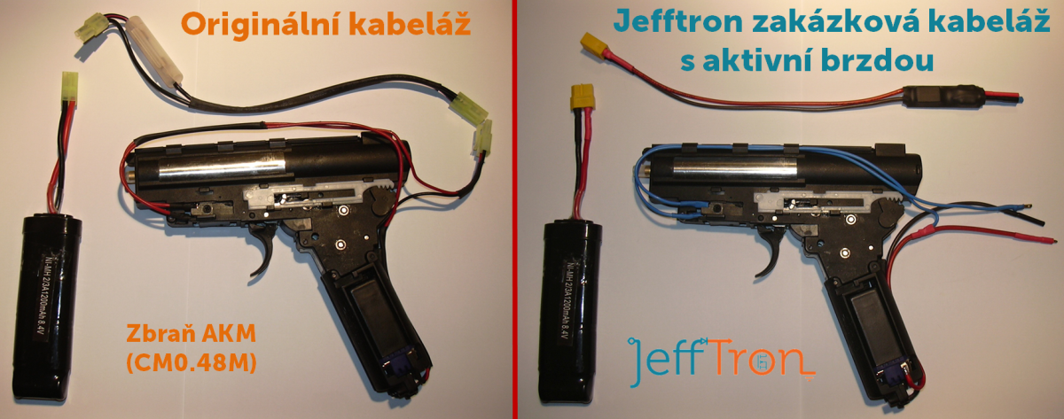 Na fotografiích je porovnání originální kabeláže a zakázkově vyrobené Jefftron kabeláže s Aktivní brzdou do zbraně CM.048M od firmy Cyma (AKM). Cena této nové kabeláže je 1065 Kč.