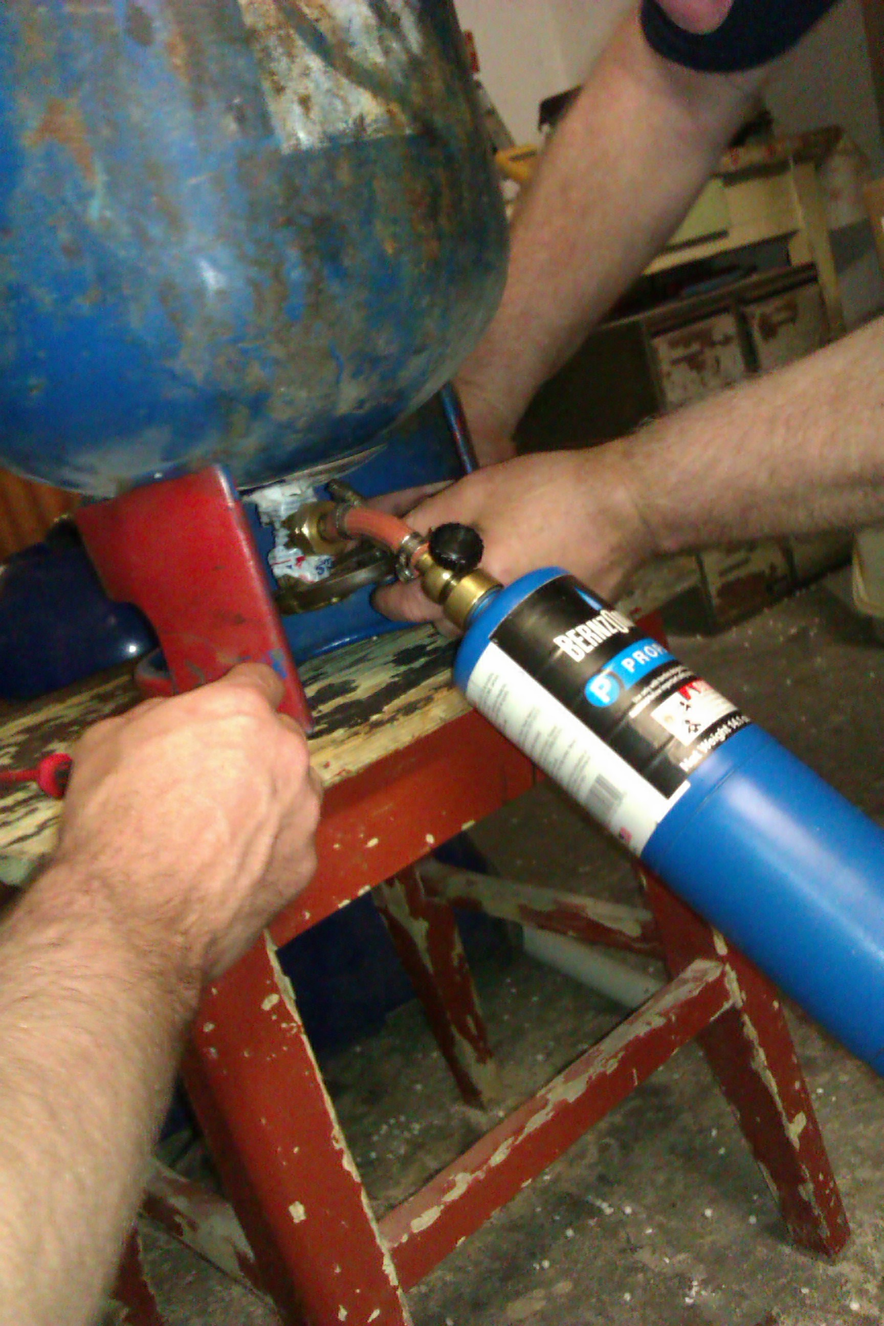 Vo fľaši už je náplň propánu z horáka si vyrobíme plniaci ventil pozor je nutné odstrániť spätný ventil (ktorý je umiestnený vo válci so šesťhranom) dierku na konci válca cez ktorú prúdi plyn nezväčšovať inak nezatlačí spätný ventil vo fľaši