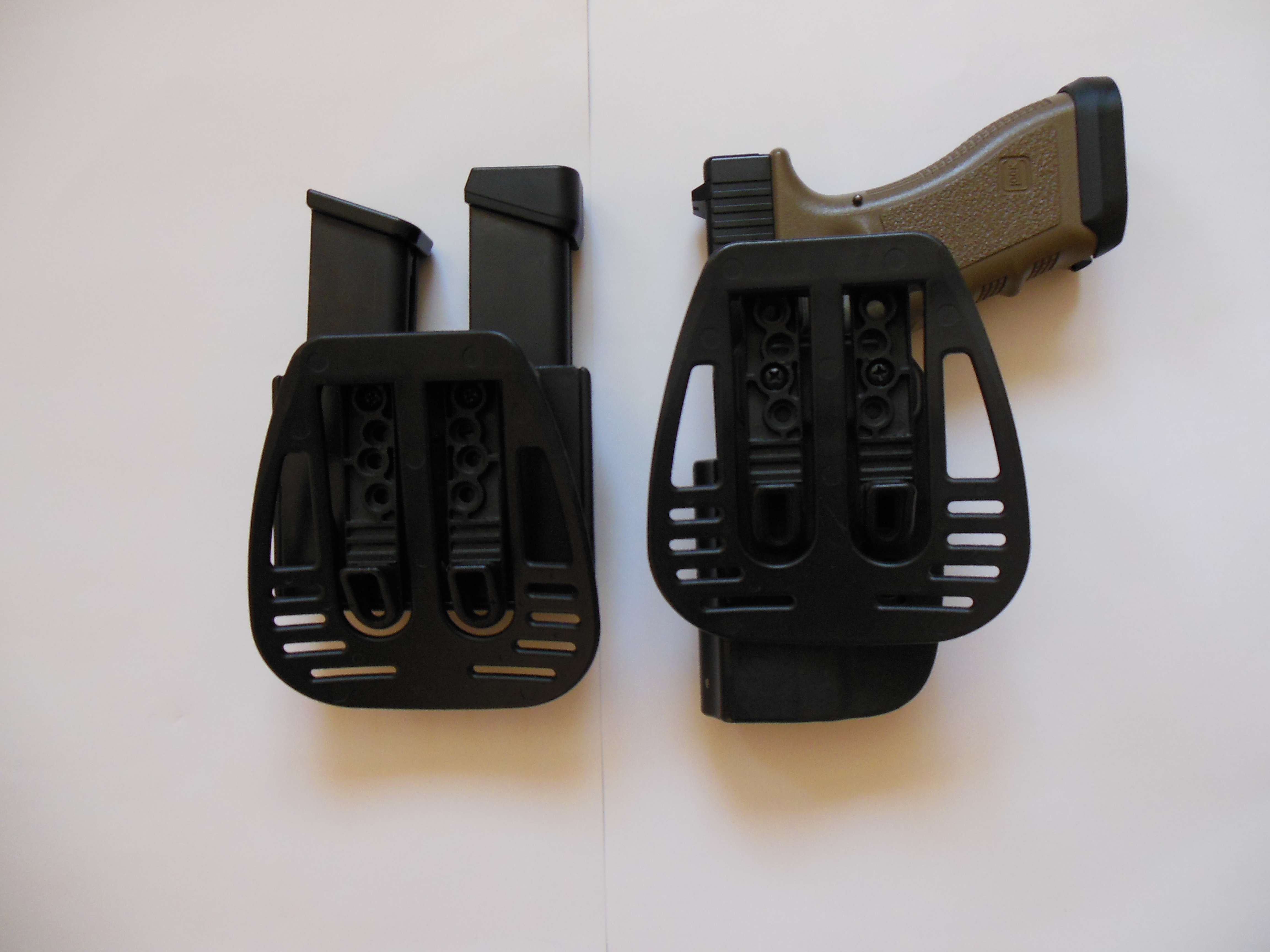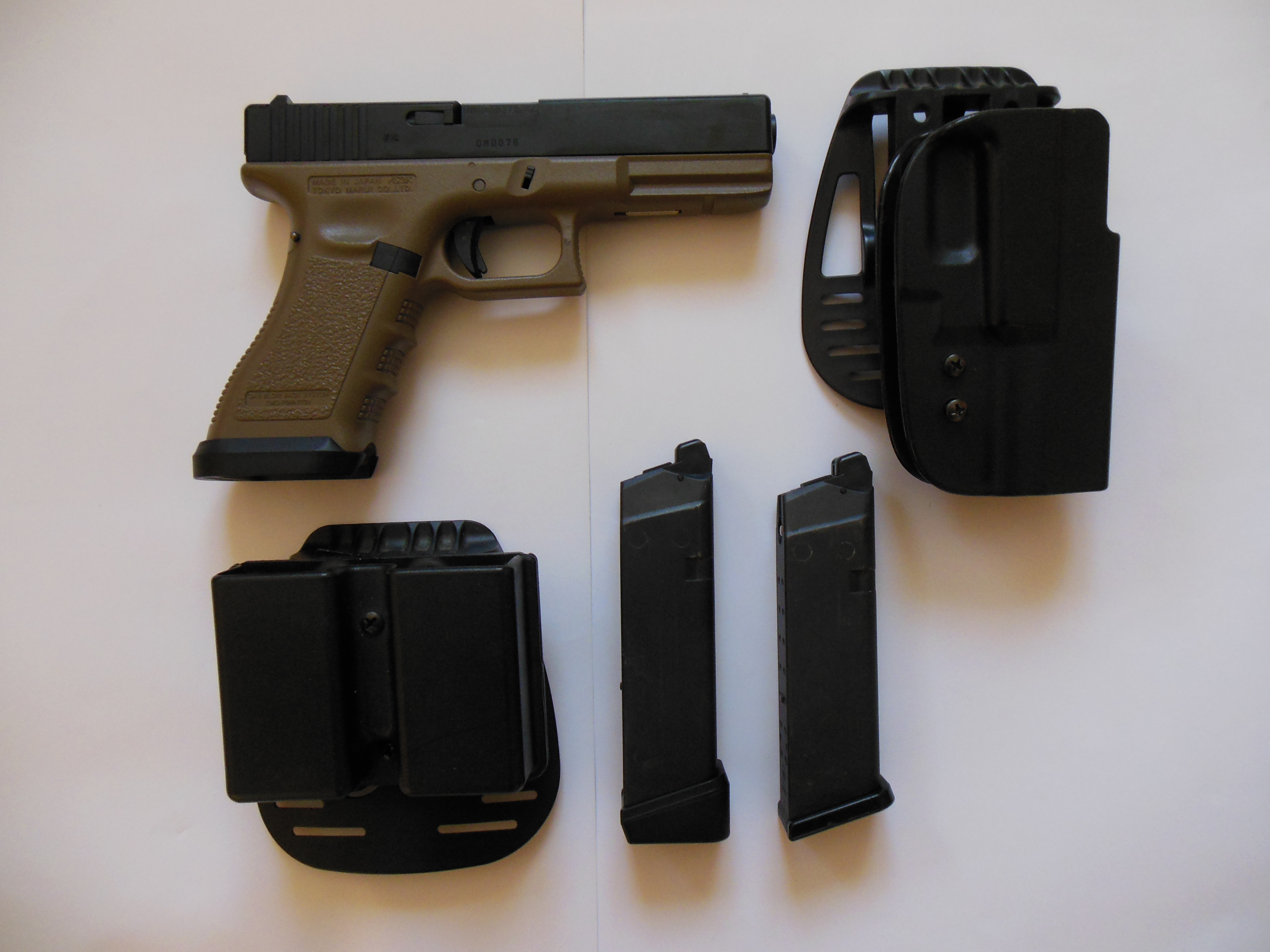 Tady je něco ode mne: TM Glock 17 Custom v základu. Pouzdro na zbraň i na zásobníky jsou od Uncle Mikes, vhodné mimo jiné i pro sportovní střelbu, protože poskytují dostatečnou mezeru mezi zbraní a tělem, což umožňuje dobrý úchop zbraně a její tasení narozdíl třeba od pouzder zn. Fobus, které jsou blíže k tělu a jsou lepší pro skryté nošení. Na zbrani chci v co nejbližší době udělat full upgrade.