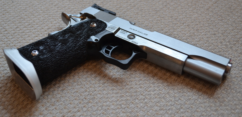 ...            No a tohle je můj sen V průběhu času jsem zatoužil po celokovu a oslovil mě design brazilského puškaře La Bramy. Náhodou jsem narazil na výrobce, který závěry v podobném designu dělal. Měl jsem také štěstí, že v tu dobu probíhali velké slevové akce a výprodeje, takže se dalo hodně ušetřit, na řadě dílu 50 % původní ceny. UpgradeRám - Davidson Custom La Brama Závěr - Davidson Custom La Brama Hlaveň - Davidson Custom La Brama Vnitřní hlaveň - Tanyo Koba Twister 6,04 mm Hop Up guma - Fire Fly SOFT Vodící tyč vratné pružiny - PROG4 Pera - AIP 160 % Blowbeck - Davidson Custom Tryska - Shooters Design Vratné pero trysky - AIP 120 % Přepouštěcí ventil - C.C. Power Up Cylinder Bulb for Marui M1911A1 Kohout - SVI 5KU ocelový Diskonector - 5KU ocelový Pojistka - Nine Ball Záchyt závěru - Nine Ball Bobří ocas - Noname Spoušť - PROG4 Muška světlovodné vlákno - 5KU Grip - WE red Magwell - PROG 4 STI Šrouby - AIP Záchyt závěru - ? Thumb stock - 5KU. Používaný plyn Ultrair. Na láhev dá kolem 2000 ran. Používané střelivo 0,25 g G&G. Před přetěsněním dávala kolem 310 FPS. Energie kolem 1,1 J. Zbraně jsou stavěné spíše na přesnost než výkon.